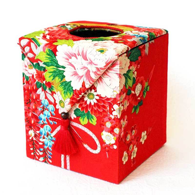 アンティーク着物・古布リメイク、ティッシュボックス、赤・花薬玉紋様