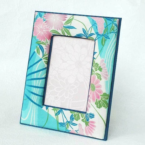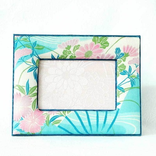 和風写真たて フォトフレーム インテリア雑貨 アンティーク着物・古布リメイク 水色・扇花紋様