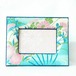アンティーク着物・古布リメイク、水色・扇文に花紋様、はんなりと柔らかい錦紗縮緬のフォトフレームです。
